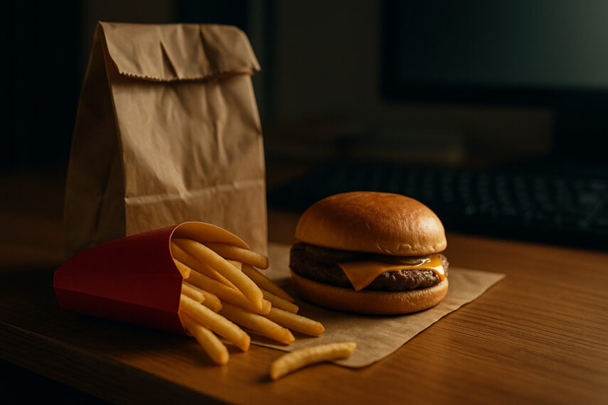 夜更けのデスクに、マクドナルドの紙袋がひとつ。