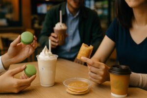 シェイクを片手に勉強してる学生、夜ドライブでホットパイを頬張るカップル、朝活帰りにマカロンでひと休みする人まで、本当にバリエーションが豊か。