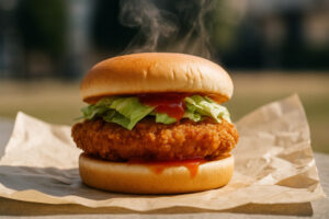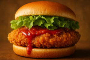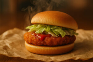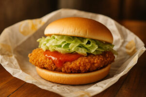 サクサクの衣、レタスのシャキシャキ、ふんわりバンズ――この三層が、刺激を“包み込む”ようにできている。