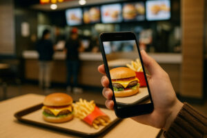 昼どきのマック、トレイの音とフライヤーの香りが交錯するなか、