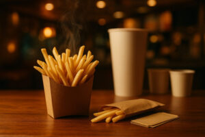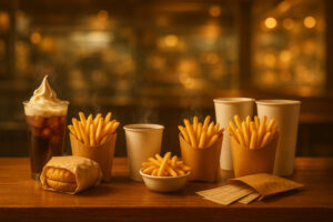 - 同時提示で会計が整流。受け取り後は最初にポテトを分ける