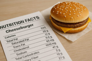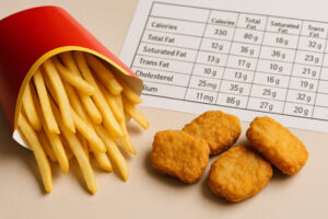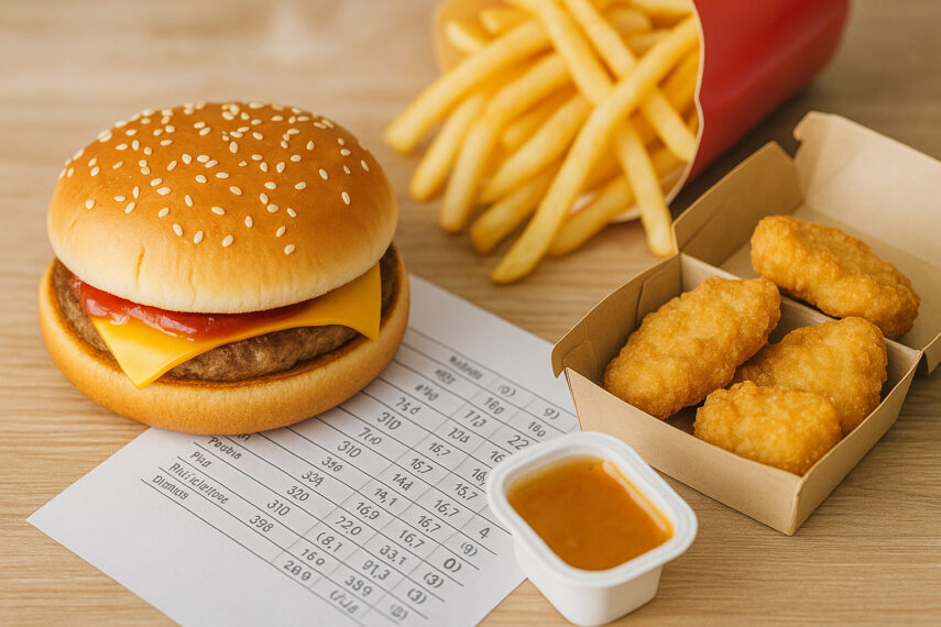 バーガー、ポテト、ソース、ドリンク——それぞれの栄養が1グラム単位で細かく公開されている。