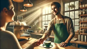 ミルクピッチャーを傾ける角度、ドリンクを手渡すときのアイコンタクト、レジ横での小さな会話。